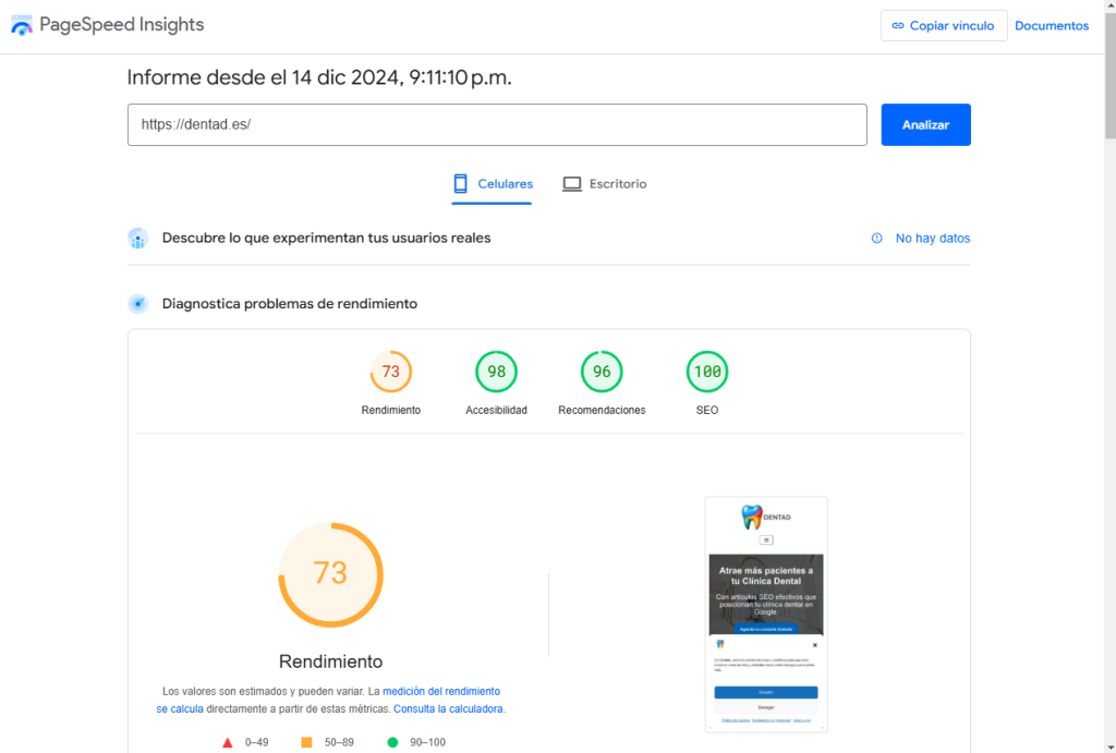- Comprueba si tu tema actual es responsive: Ve a PageSpeed Insights y mete tu URL. Debería estar en verde… sin embargo en naranja es aceptable. (Nosotros aún estamos en naranja).